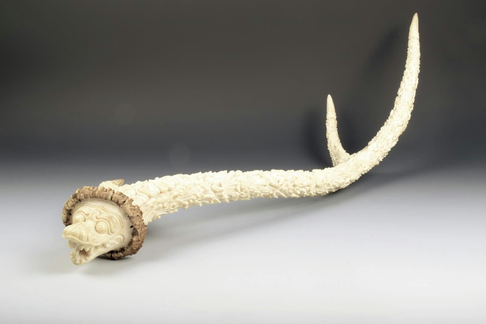 A Nepalese carved antler, with figures and foliage, the terminal with dragon mask, 66.5cm long.