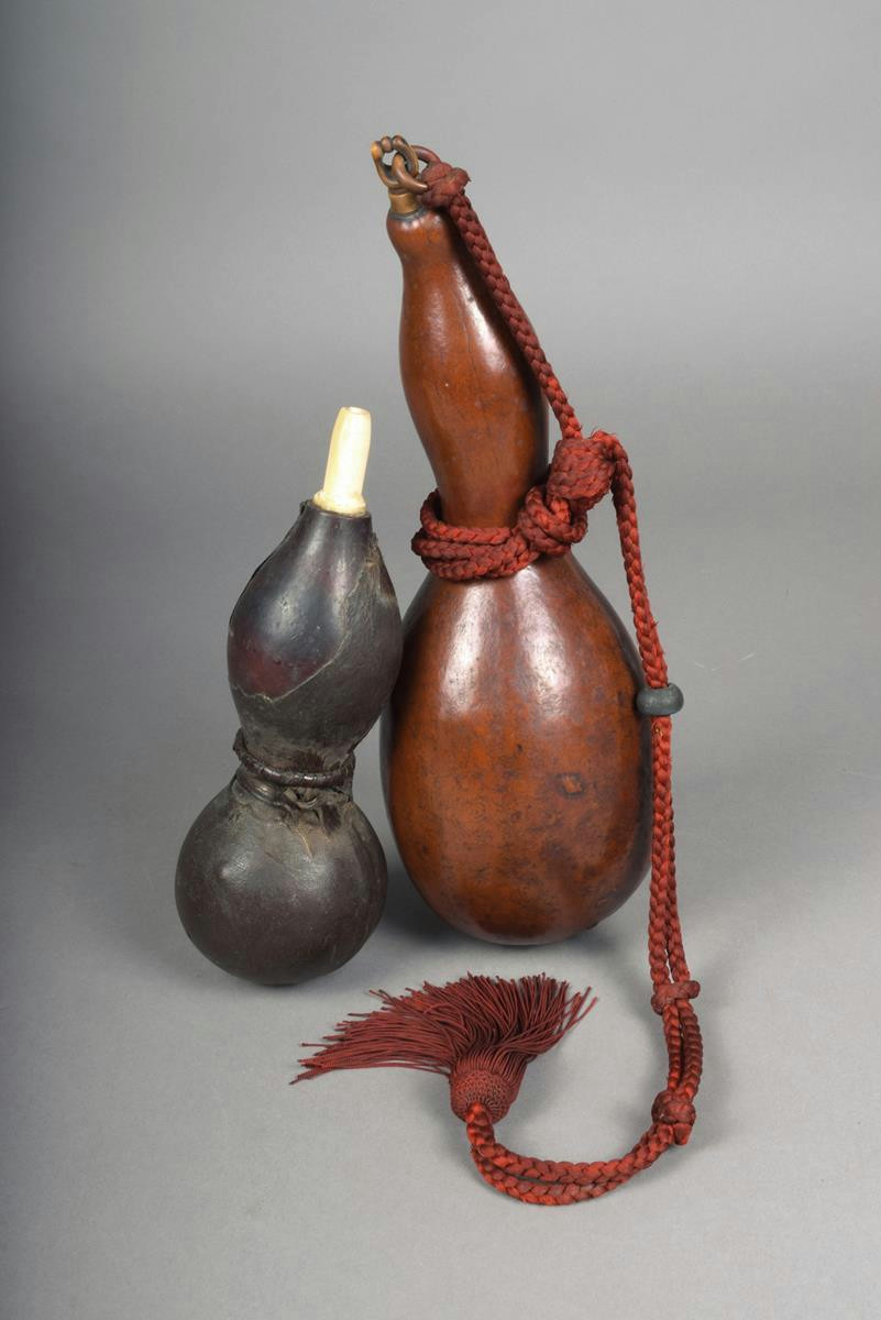 A Japanese double gourd, with carved horn stopper and red silk rope with a blue stone toggle, 32cm high; and a double gourd flask, hide covered with a bone spout, 23cm high. (2)