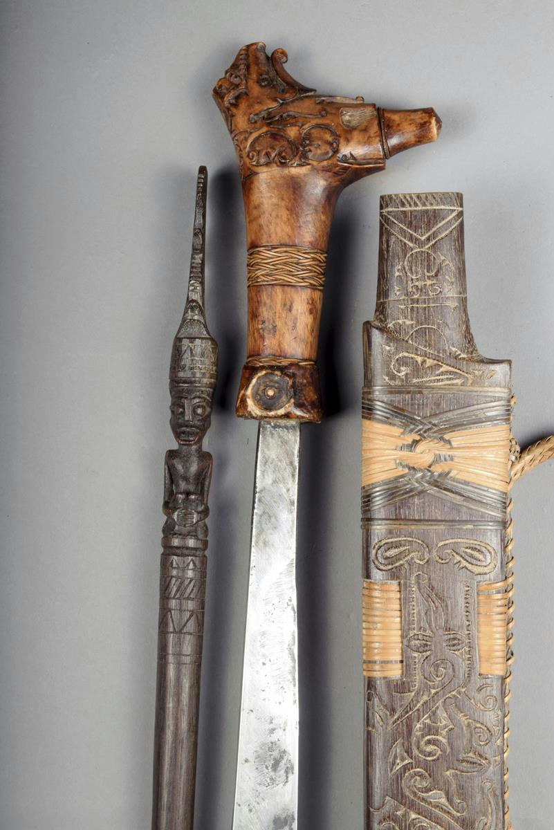 An Indonesian madau, notched steel blade with inset gilt circles, with a carved bone handle and a carved wooden scabbard and a further attached scabbard with short spear having a carved ancestor handle, 89cm long.