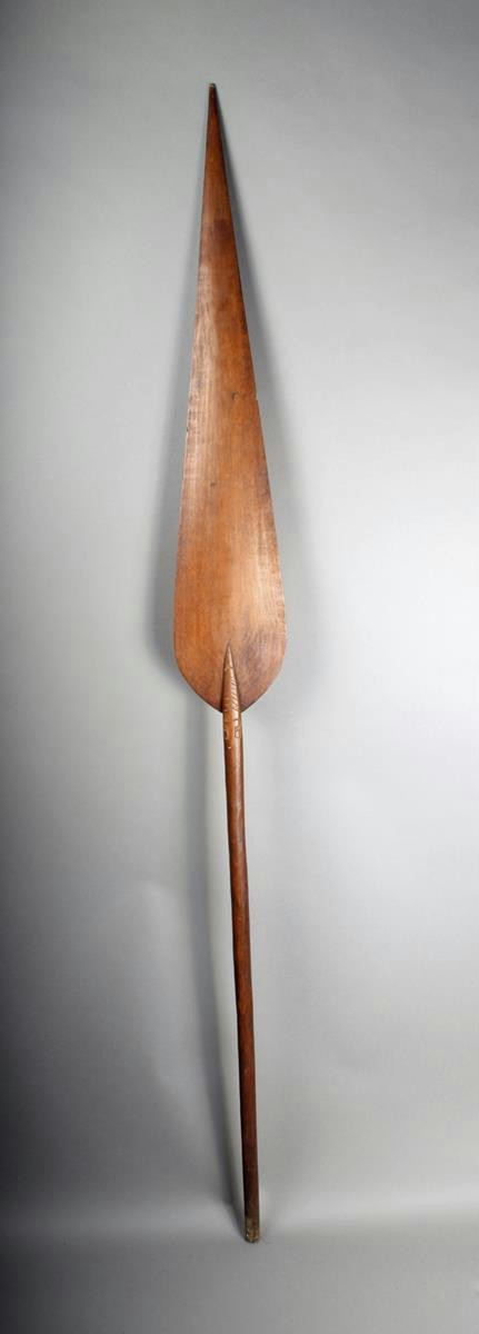 An Oceanic paddle, with a slender blade and carved mask to the top of the shaft, 184cm long