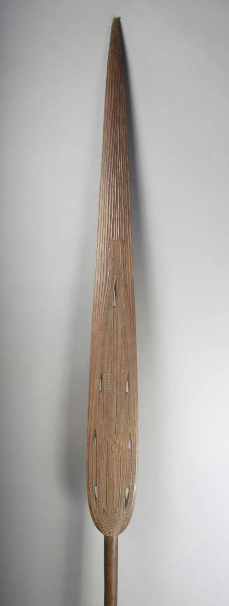 An Oceanic paddle, with a slender carved blade, pierced with chevrons and fluting, 207cm long.