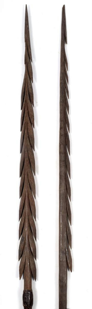 Two South Seas barbed spears, 302.5cm long and 279cm long. (2)