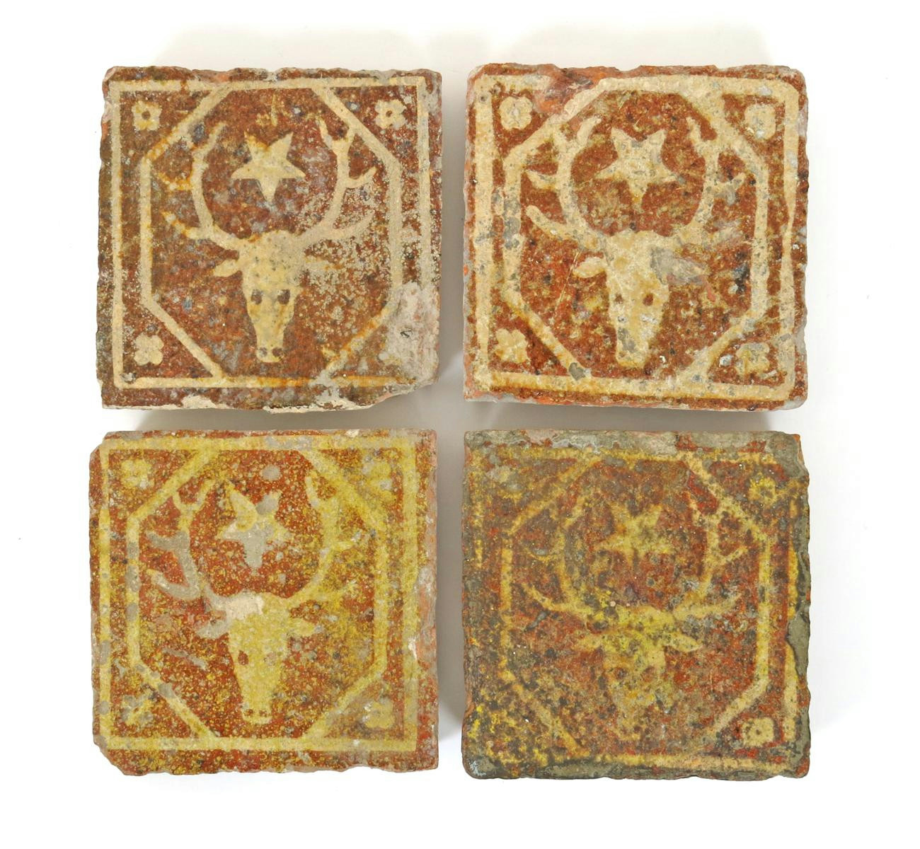 Four post-medieval encaustic tiles, each decorated in inlaid pale slip with an antlered stag's head within a hexagonal panel, a five-pointed star between the antlers, all within a square with a flowerhead in each corner, surface wear, 12.5cm. (4)