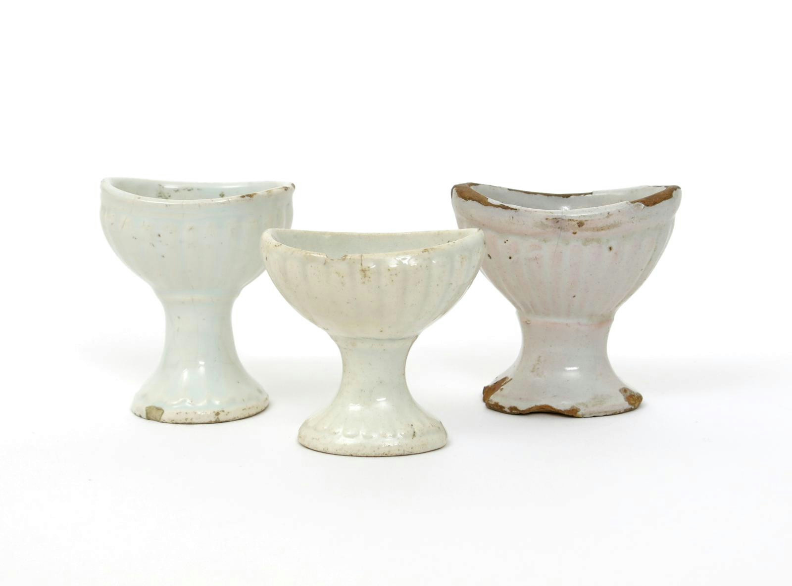 Three tin-glazed earthenware eyebaths probably 19th century, variously moulded with ribbed or fluted bowls raised on flared feet, two with additional fluting to the stems, some chipping, 5.1cm max. (3)