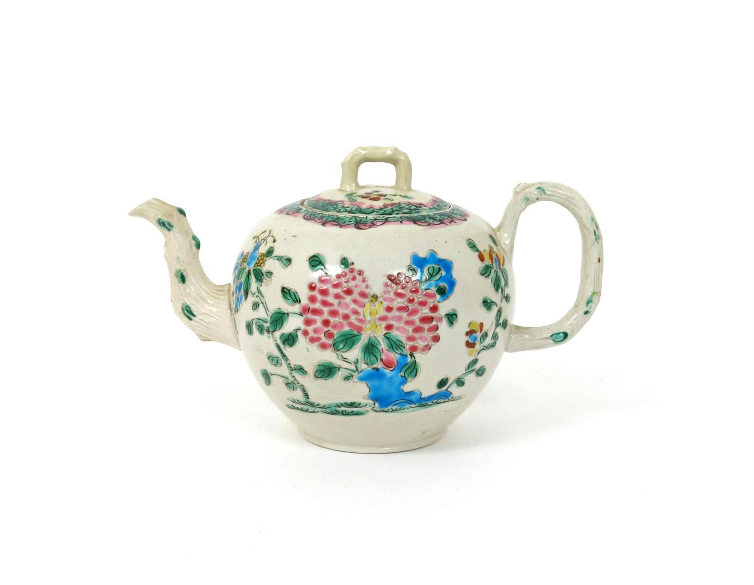 A Staffordshire salt-glazed teapot and cover c.1760, the globular form brightly enamelled with large pink chrysanthemum blooms issuing from turquoise rockwork and further Oriental blooms, the spout and handle formed as gnarled branches, a little restoration, 18.5cm across. (2)