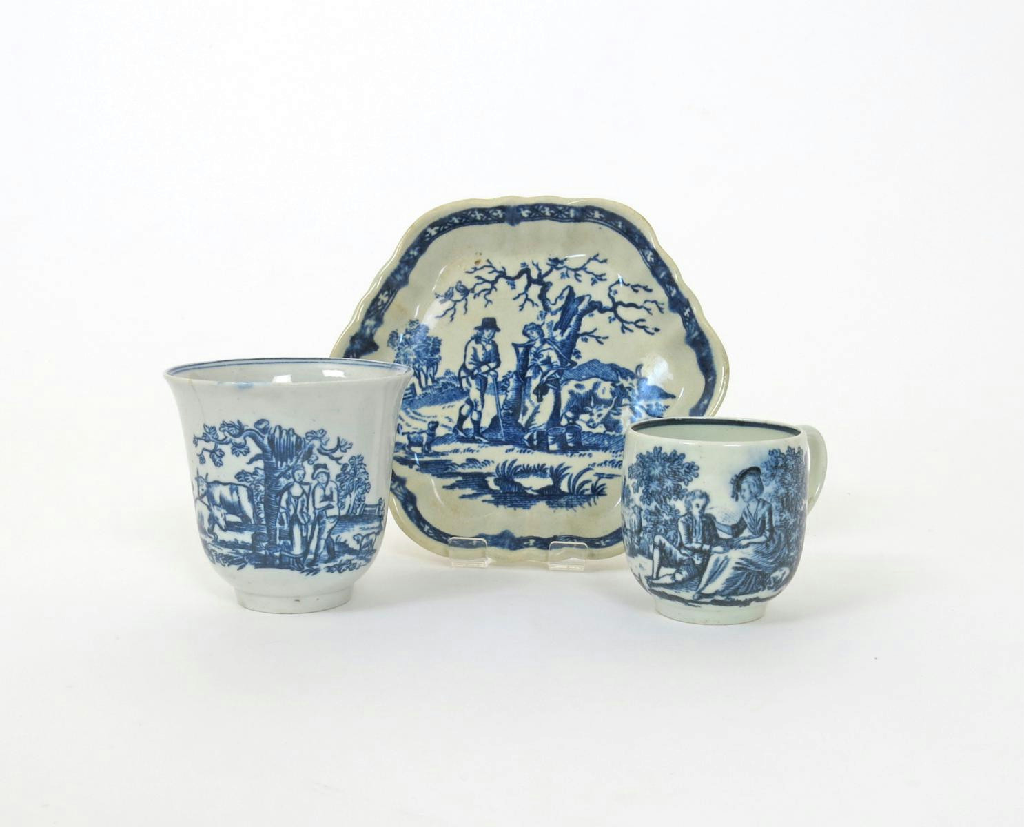 A John and Jane Pennington (Liverpool) blue and white teapot stand c.1780, and a Seth Pennington beaker, each printed with the Rural Lovers scene, and a coffee cup printed with a similar scene of a courting couple beside a flock of recumbent sheep, 14.8cm max. (3)