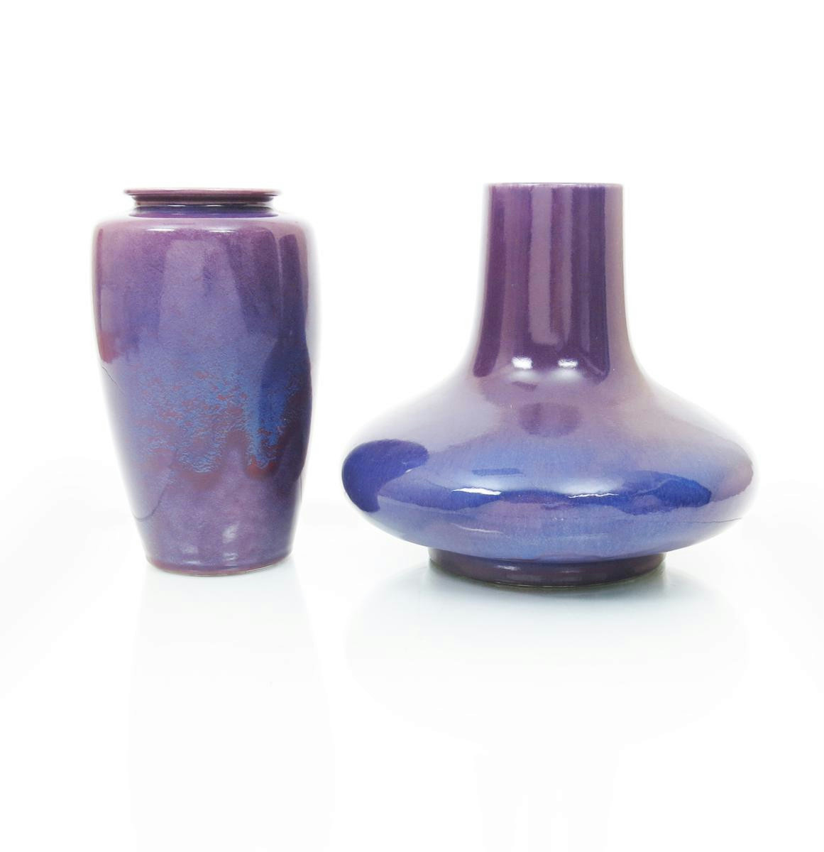 A Ruskin Pottery stoneware vase by William Howson Taylor, dated 1907, compressed body with tapering neck, covered in a purple souffle glaze, and another Ruskin Pottery shouldered vase dated 1911, impressed marks, date marks, hairline to top rim of 1911 vase, 22cm. high (2)