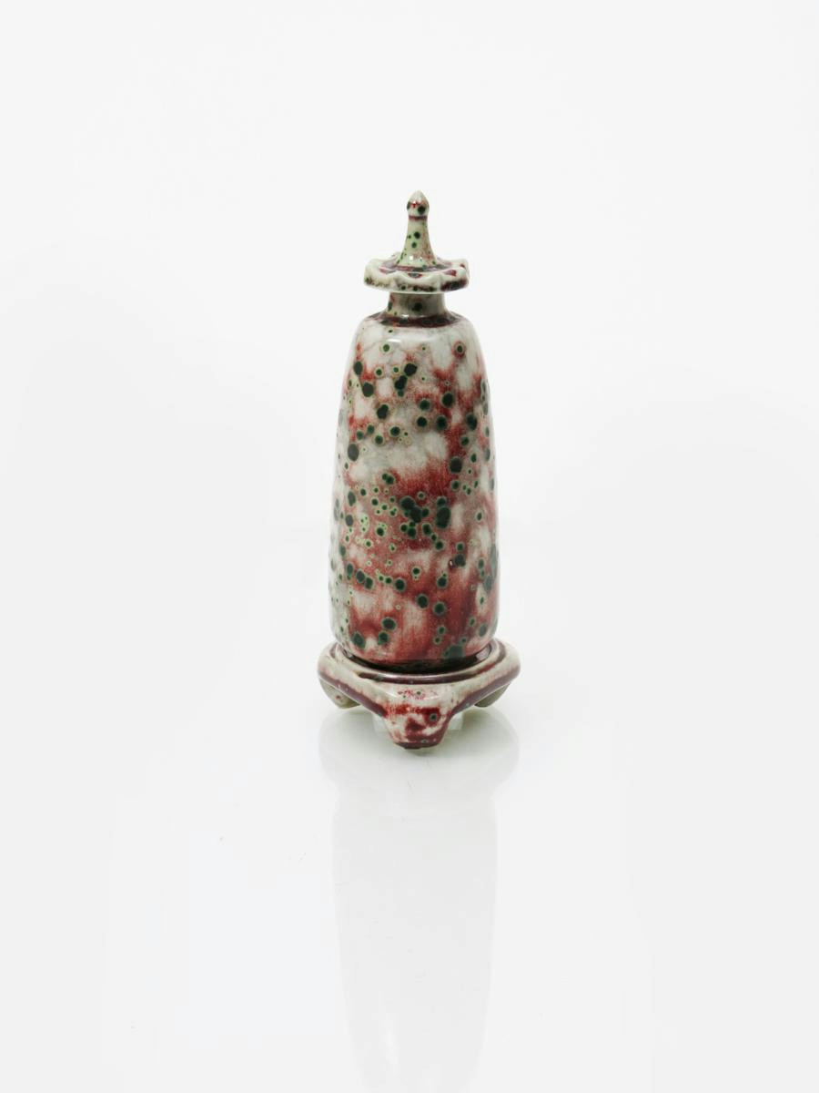 A Rare Ruskin Pottery high-fired stoneware scent bottle, stopper and stand by William Howson Taylor, dated 1907, silver grey glaze covered with mottled sang de boeuf glaze and mint green spots impressed Ruskin England and date 18.5cm. high (3)