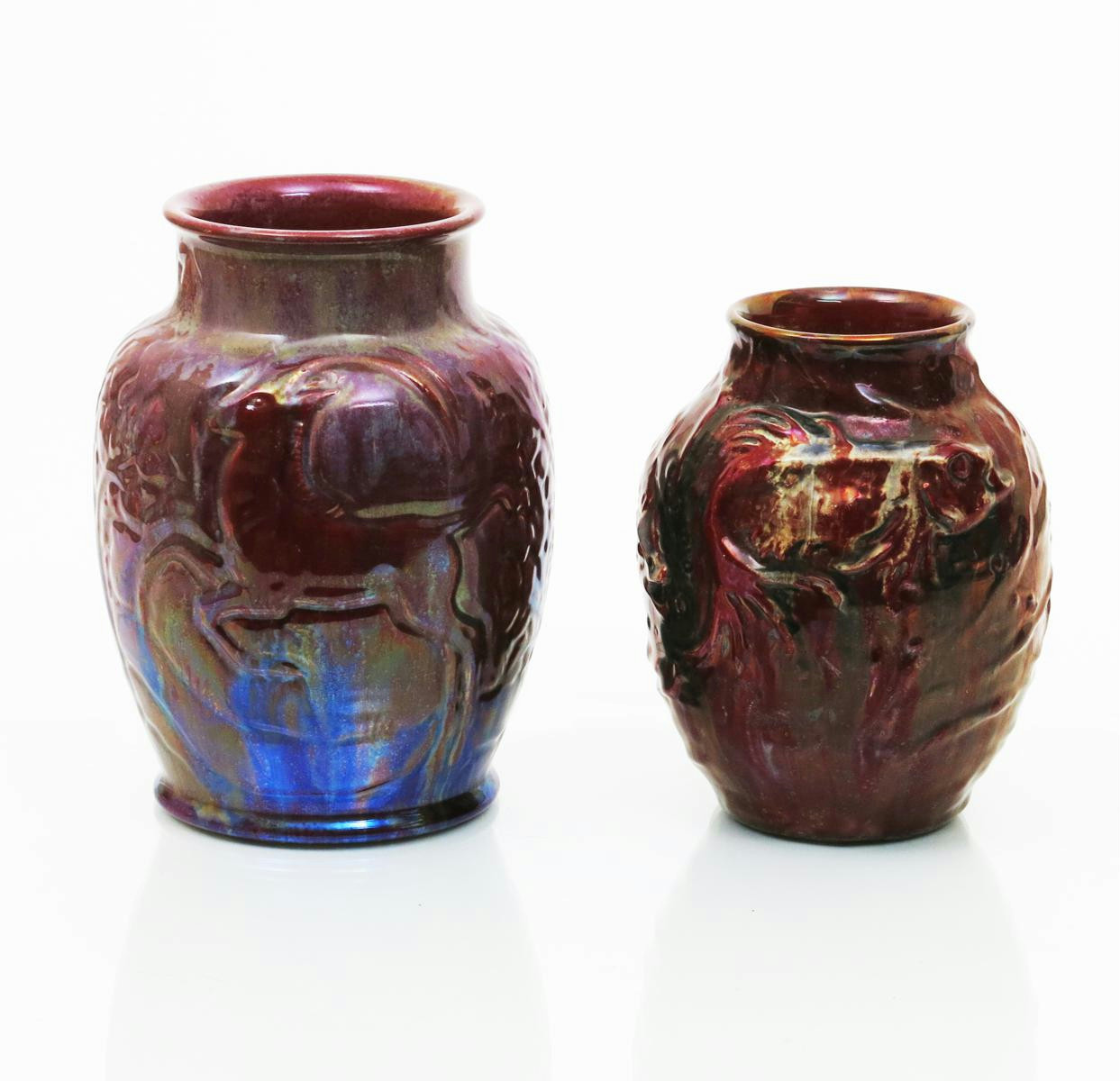 A Pilkington's Lancastrian Pottery vase by Richard Joyce, modelled in low relief with fish swimming amongst waterweed, covered in a streaked red lustre glaze, and another Pilkington's vase modelled in low relief with leaping Ibex, covered in a streaked flambe red and lavender glaze impressed mark, painted artist cipher, 17cm. high (2)