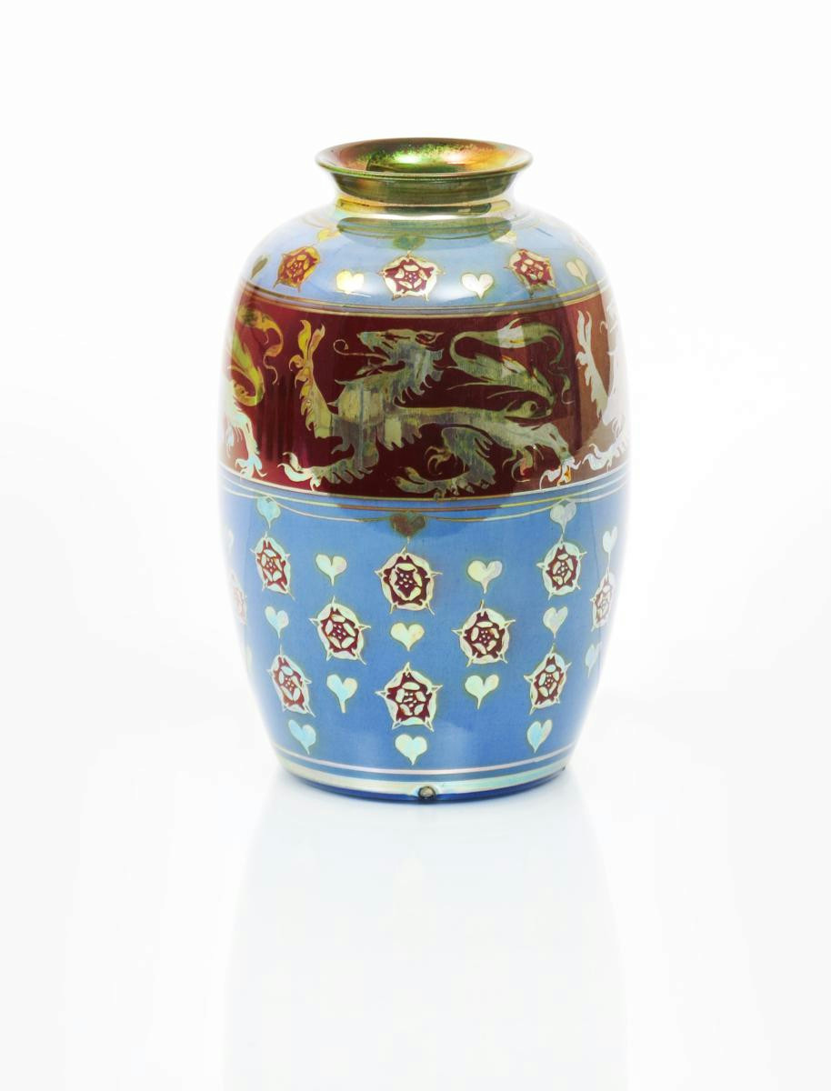 A Pilkington's Lancastrian vase by Gordon M. Forsyth, dated 1908, shouldered form, painted with a band of heraldic Lion Passant, between Tudor rose and heart-shaped foliate borders, in red and golden lustre on a pale blue ground impressed marks, painted artist cipher and date code 19.5cm. high
