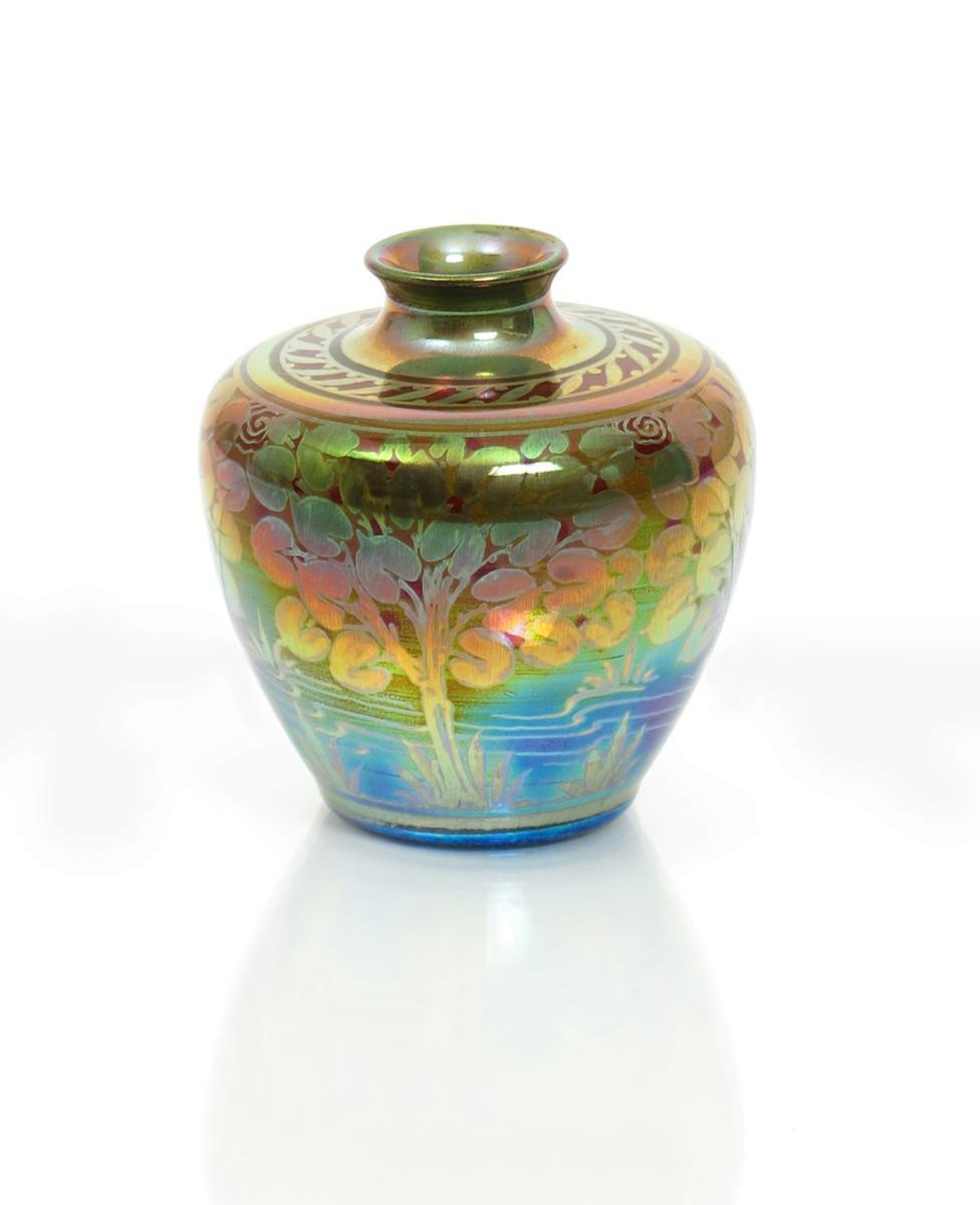 A Pilkington's Lancastrian vase by Charles Cundall, dated 1911, ovoid with collar rim, painted with a frieze of stylised trees, in golden lustre on a red and orange lustre ground impressed mark, painted artist cipher and date code 9.5cm. high