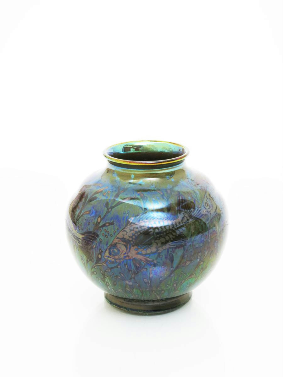 A Pilkington's Royal Lancastrian vase by Richard Joyce, ovoid with everted collar rim, painted with scaly fish swimming amongst waterweed, painted in ruby and gold on a streaked green ground impressed marks, painted artist cipher, 11cm. high