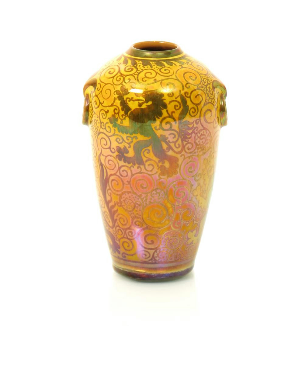 A Pilkington's Lancastrian vase by Richard Joyce, dated 1910, shouldered form, moulded with twin loop handles, painted with heraldic lion rampant before scrolling foliage, in copper and golden lustre on a bright orange ground impressed mark, painted artist cipher and date mark, 14.5cm. high
