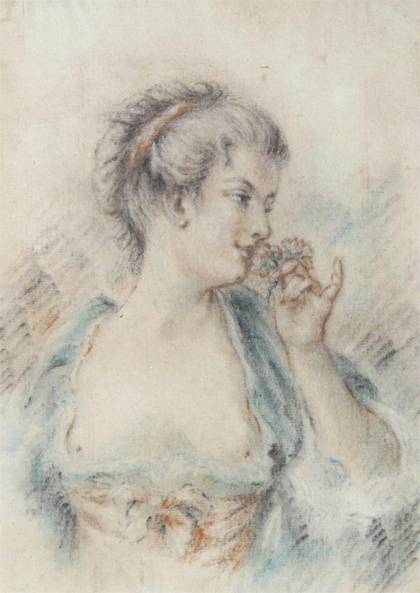 French School 18th/19th Century Portrait of a lady smelling a flower Coloured chalks 31 x 22cm;...