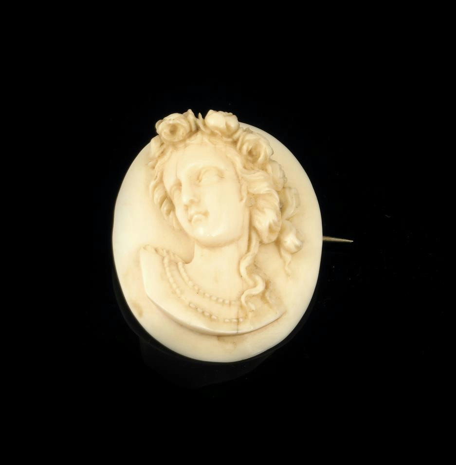 λ A Victorian carved ivory brooch, of a bust of a young lady with flowers in her hair, 4.8cm high.