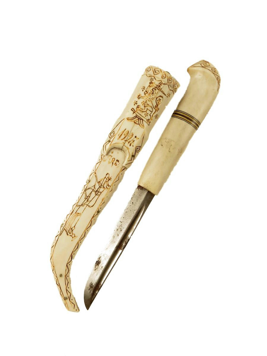 A Scandinavian bone handled knife, the scabbard etched a rampant lion crest, with a reindeer pulling a sleigh and dated '1927' and initialled 'ARC', 25.5cm long.