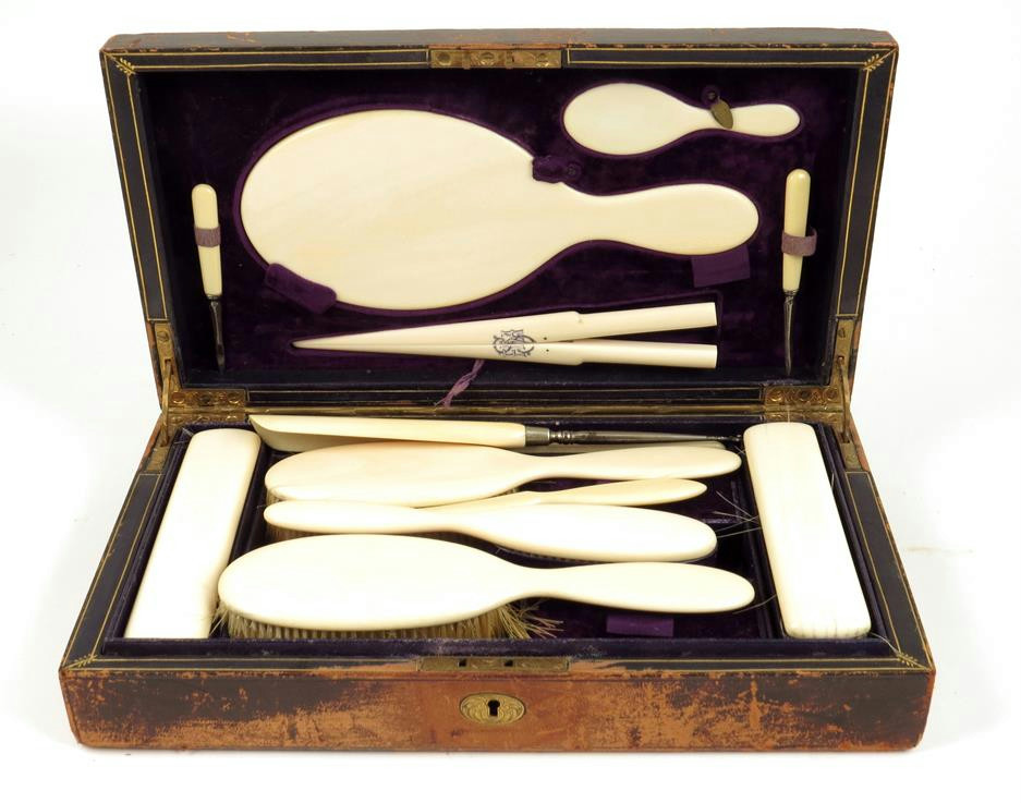 λ A 19th century leather cased toilet set, the lid with a sunken handle, comprising: ivory backed brushes, mirrors, a shoe horn and button hook, glove stretcher and other utensils, all in a fitted plush and leather lined case, with foliate engraved brass work, 9cm high, 37.4cm wide.