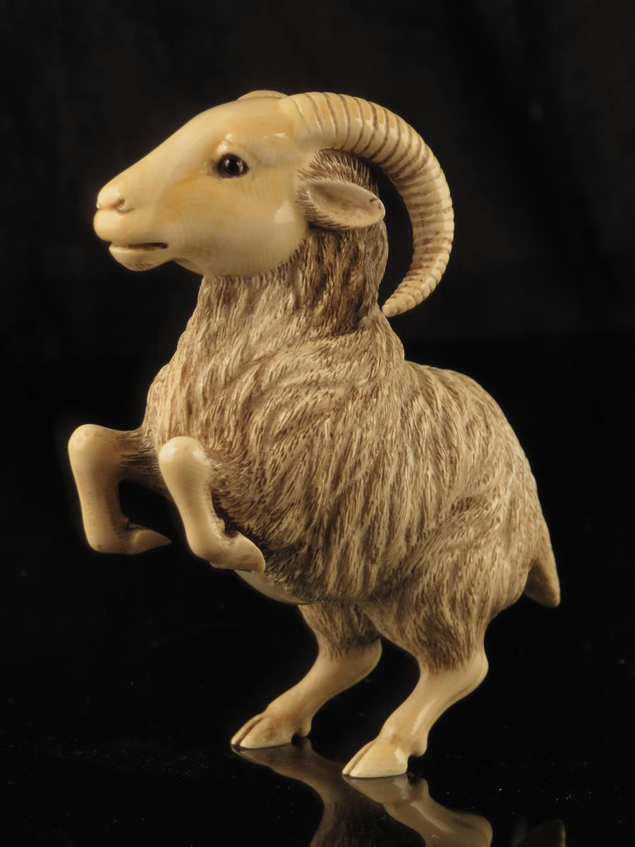 λ A late 19th century continental carved ivory model of a rearing ibex