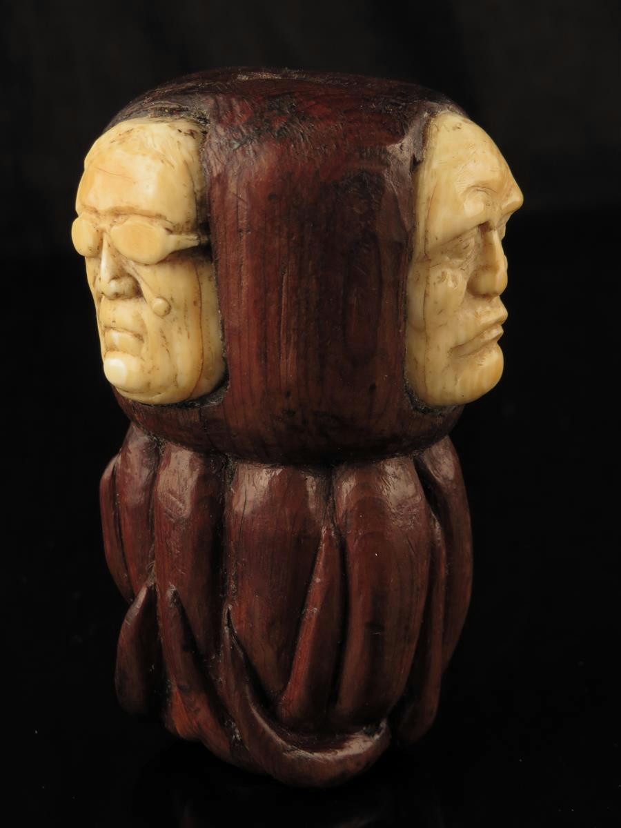 λ A stained pine and ivory cane handle, inset with three carved ivory grotesque heads, 19th century, 8.5cm high.