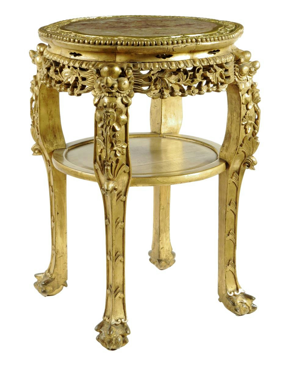 A Chinese giltwood jardinière stand, the lobed top inset with marble with a leaf carved surround and a leaf and berry pierced frieze, late 19th century, 81.4cm high, 47.5cm wide.