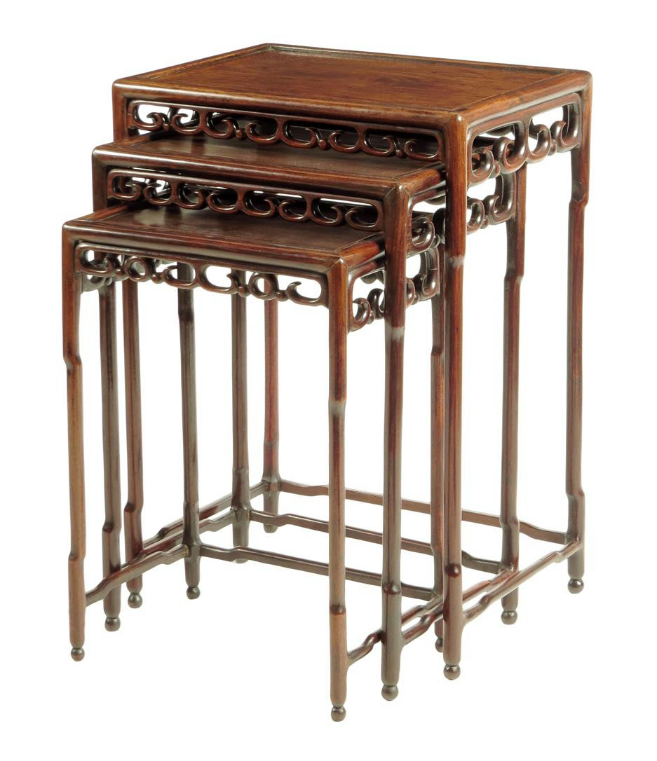 A nest of three Chinese padouk occasional tables, each with fret carved friezes on stretchered supports, late 19th / early 20th century, 71.3cm high, 50.2cm wide, 36.5cm deep, max. (3)