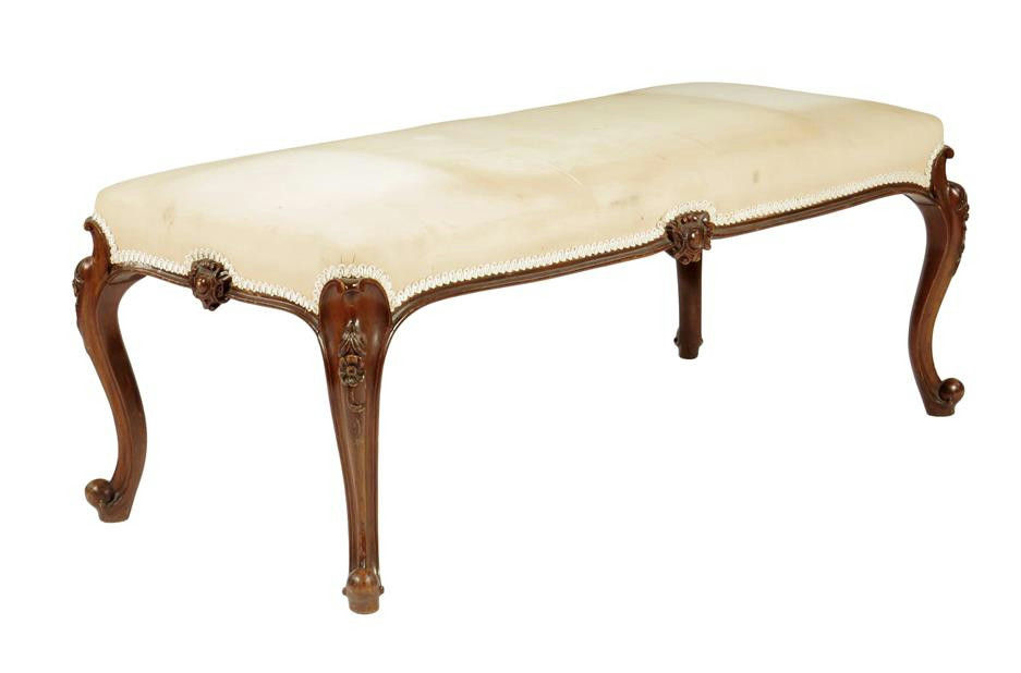 A Victorian mahogany long stool, the serpentine moulded edge, centred carved cartouches and on flower carved cabriole legs and scroll toes, 46cm high, 120.4cm wide, 56.2cm deep.