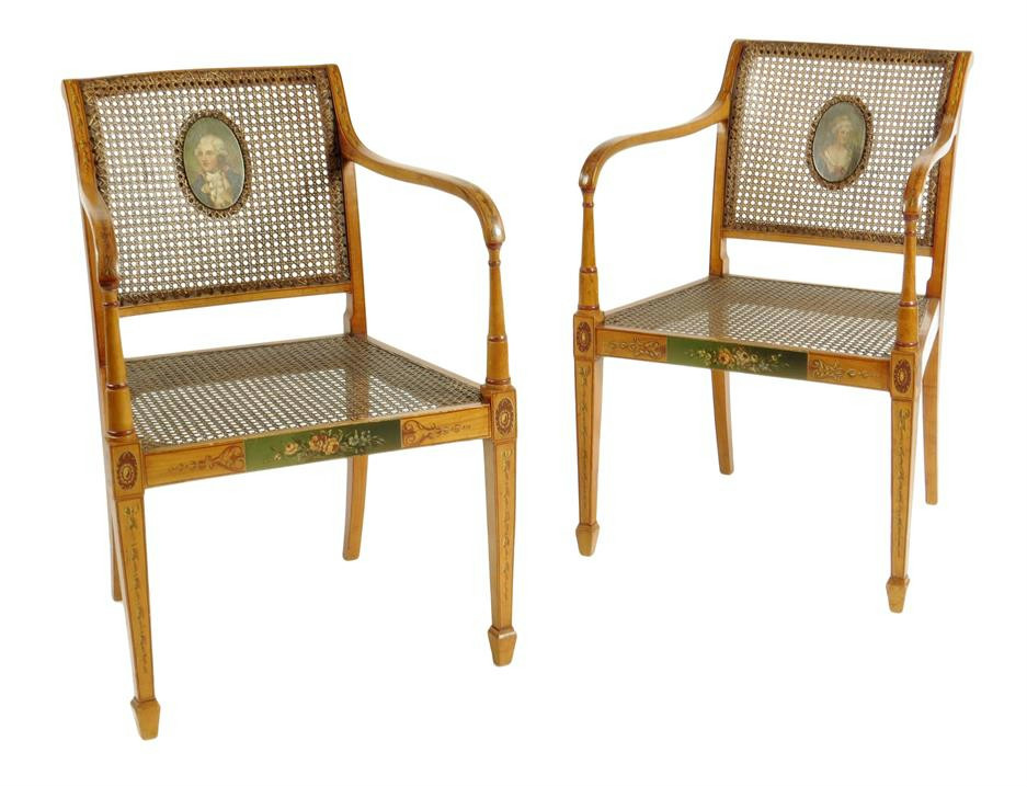 A pair of satinwood Sheraton revival open armchairs, each with a cane back and seat and with an oval panel painted with the portraits possibly of George III and Queen Charlotte, the frames painted with bell flowers, paterae and panels of floral sprays, late 19th century. (2)