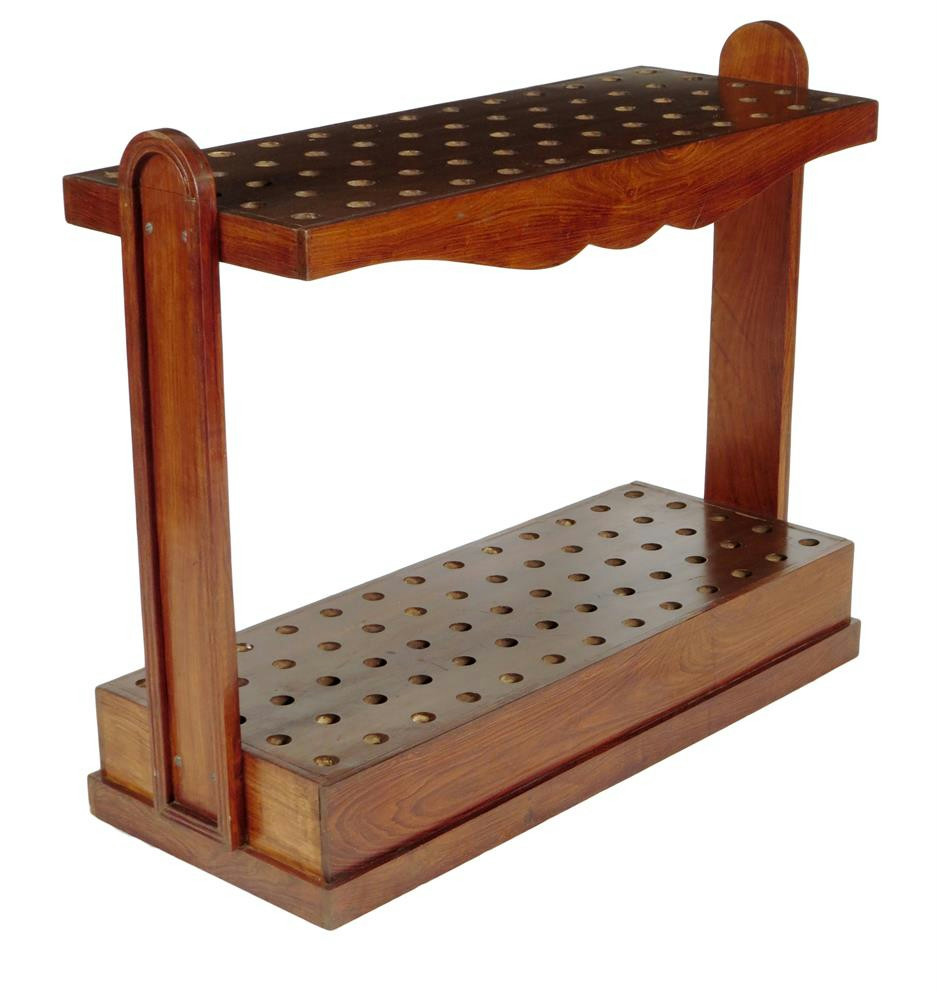 λ A mahogany and rosewood stickstand, with circular apertures for sixty-five sticks, with arched panelled ends, 81.4cm high, 99cm wide, 40cm deep.