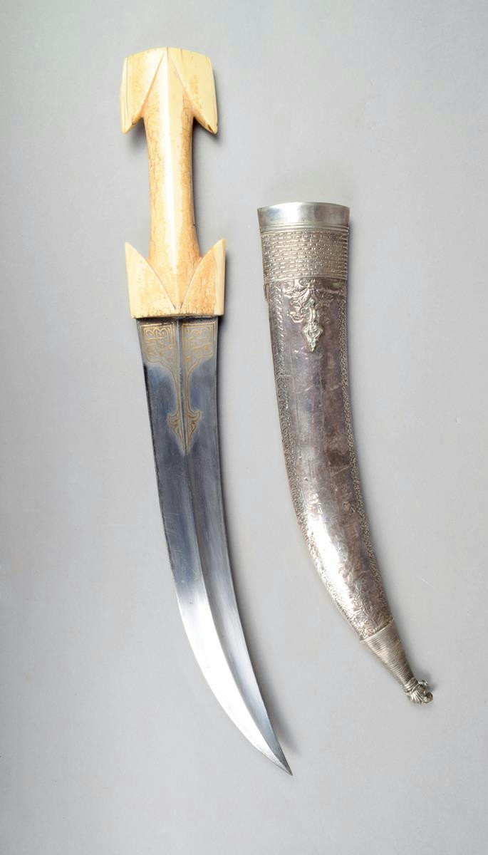 λ A Persian khanjar, with a curved blade, 34.2cm long with central medial ridge and gold inscription, with a shaped walrus ivory handle, with a silver coloured metal scabbard with foliage decoration and leaf scroll finial. 56cm long.