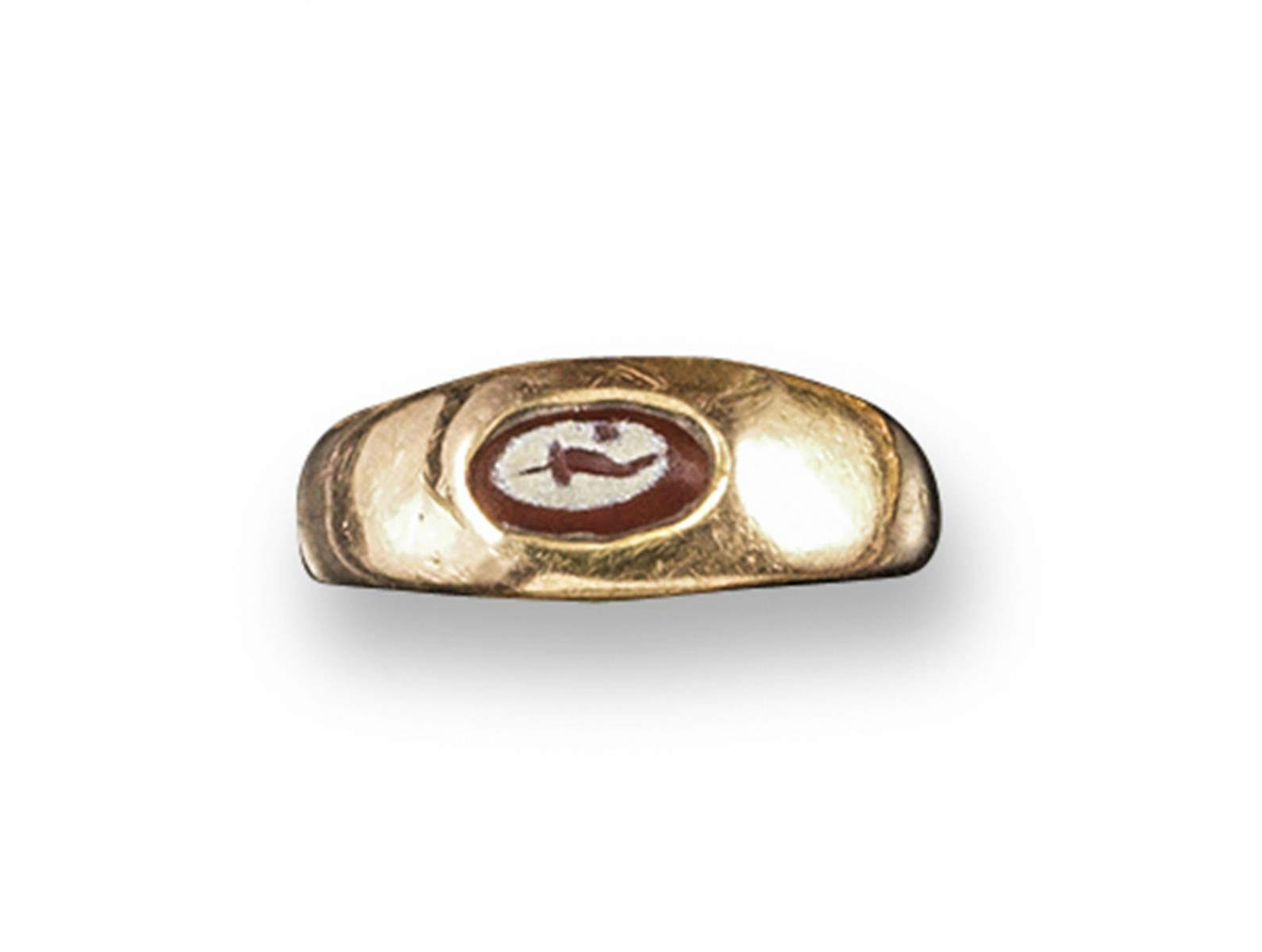 A Roman gold ring, mounted with a small oval-shaped engraved agate possibly depicting a torch. Oval-form.