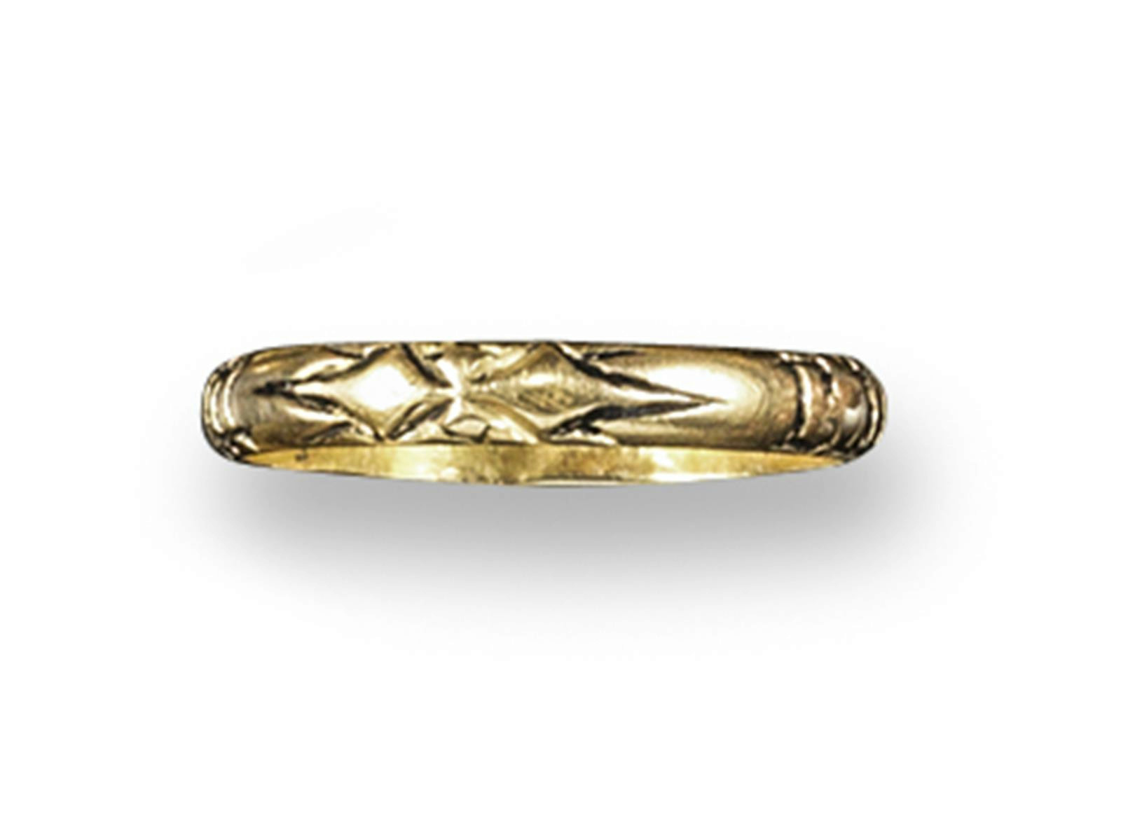 A gold engraved ring, probably 18th century. Remains of black enamel to interior and outside. Size L.
