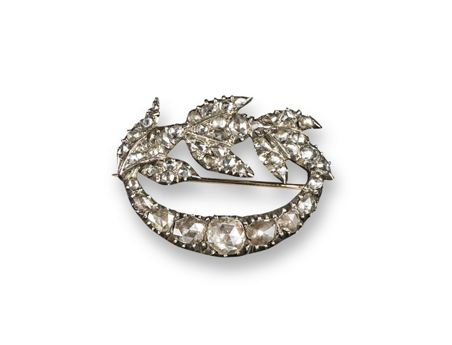 A George III diamond set foliate brooch, set overall with rose-cut diamonds in silver and gold. Closed back mount. 3.5cm wide. Case by Reed of Jermyn Street.