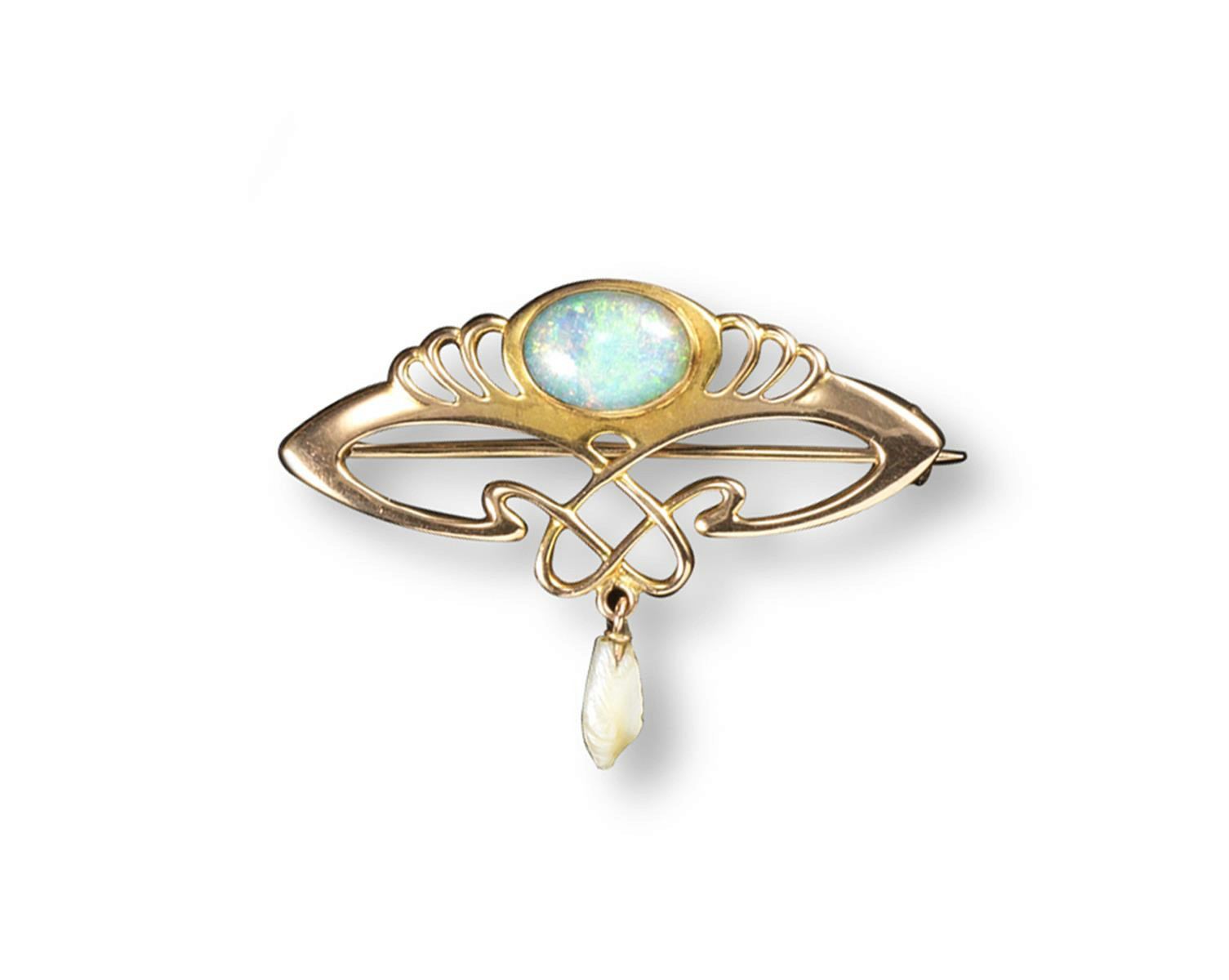 A gold Art Nouveau brooch, set with an oval-shaped opal and pearl drop. 4cm wide.
