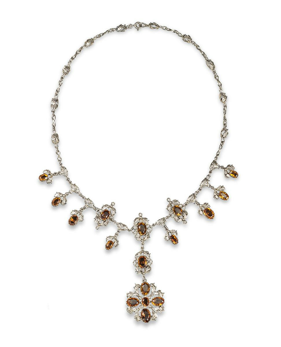 An Arts and Crafts necklace by Kate Eadie, set overall with graduated oval-shaped citrines to the foliate silver mounts on an ornate chain decorated with foliate links. The pendant and centre-section 8cm high the necklace 38cm long. Unsigned. Fitted case by Tadema Gallery.
