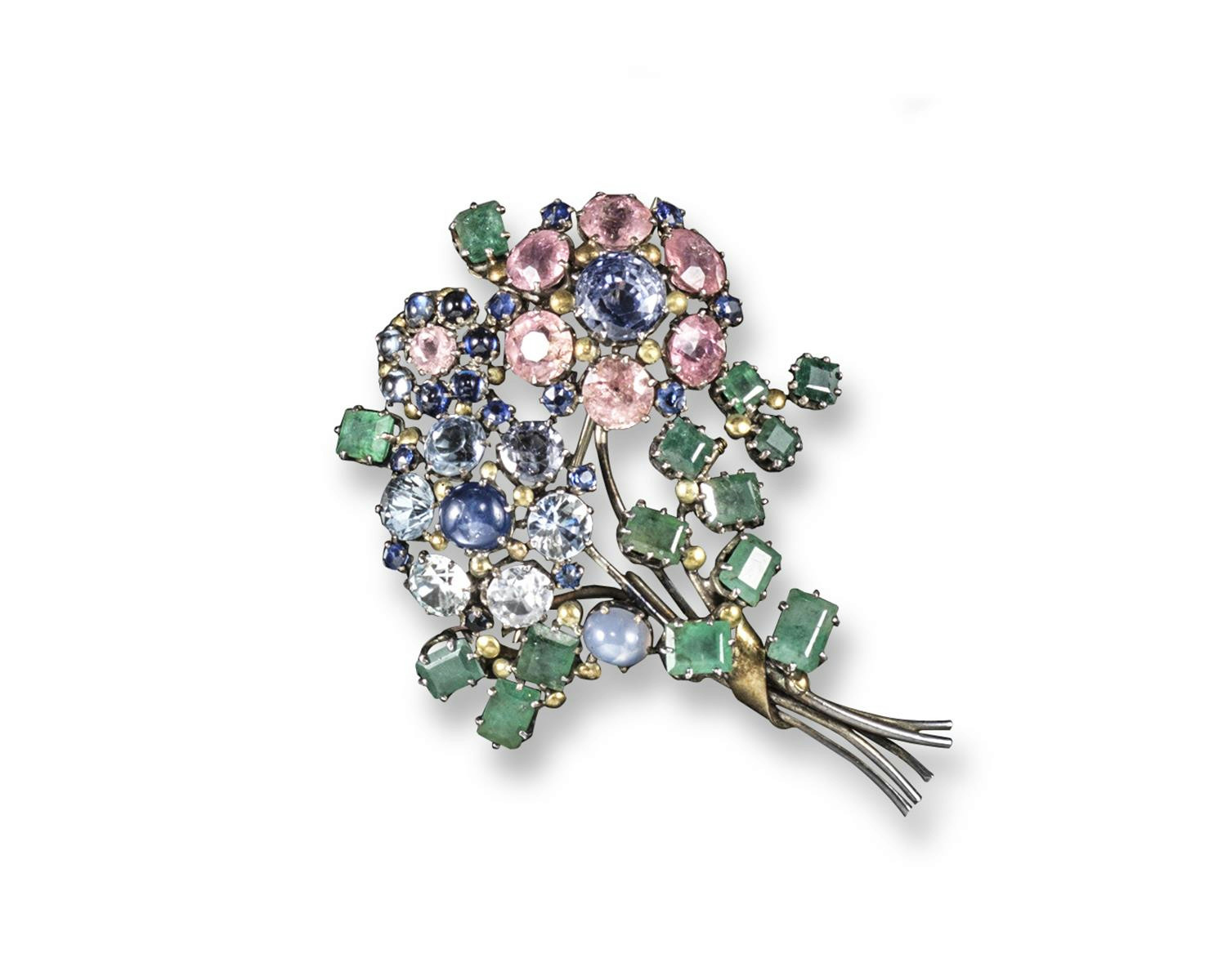 An Arts and Crafts gem-set floral brooch probably by Dorrie Nossiter, C1930. Designed as three flower heads and foliage and set overall with sapphires, emeralds, zircons and pink stones. Set in silver. Unsigned. 6.8cm high.