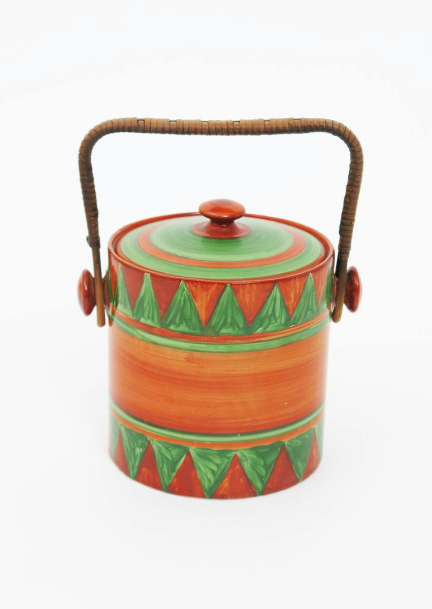 'Original Bizarre' a Clarice Cliff Bizarre Hereford biscuit barrel and cover, painted with bands of red and green triangles with central red band, the cover green and red bands printed factory mark, red Bizarre mark 17cm. high