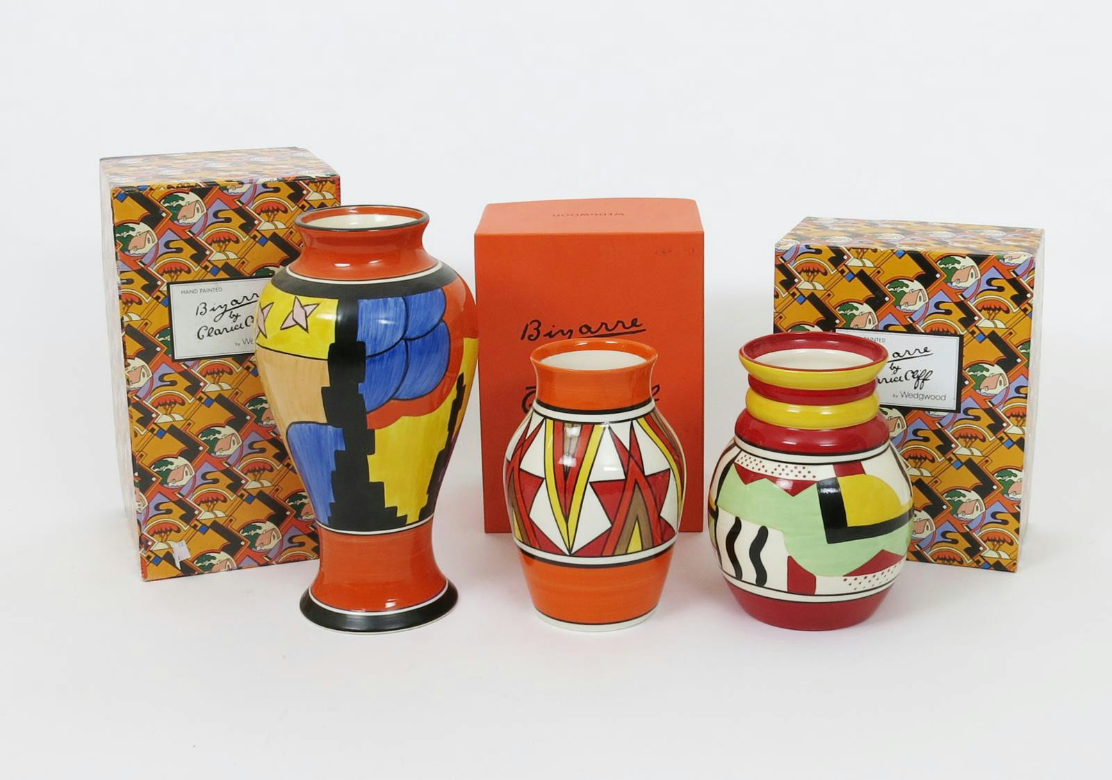 'Sunspots' a modern Wedgwood limited edition vase from a design by Clarice Cliff, produced for the Clarice Cliff Collector's club, in original box, and three other modern Wedgwood pieces printed marks, 21cm. high (4)