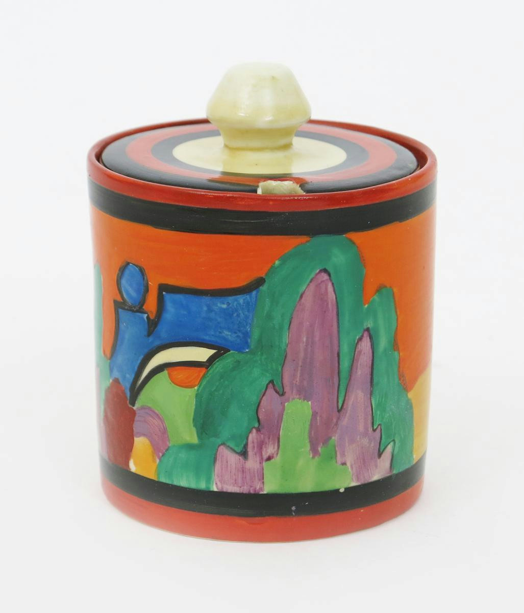 'Applique Avignon' a Clarice Cliff Bizarre Cylindrical preserve pot and cover, painted in colours printed and painted marks, restored, 8.5cm. high