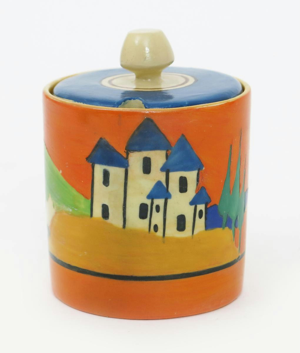 'Applique Lucerne' a Clarice Cliff Bizarre Cylindrical preserve pot and cover