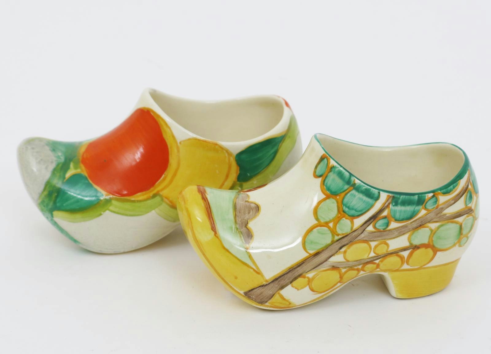 'Secrets' a Clarice Cliff Bizarre Clog, painted in colours, and a Clarice Cliff Delecia Oranges Clog printed factory marks, 10.5cm. wide (2)