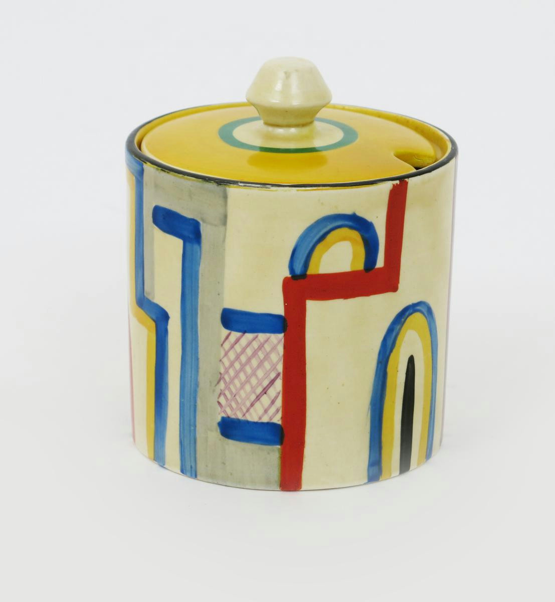 'Tennis' a Clarice Cliff Bizarre Cylindrical preserve pot and cover