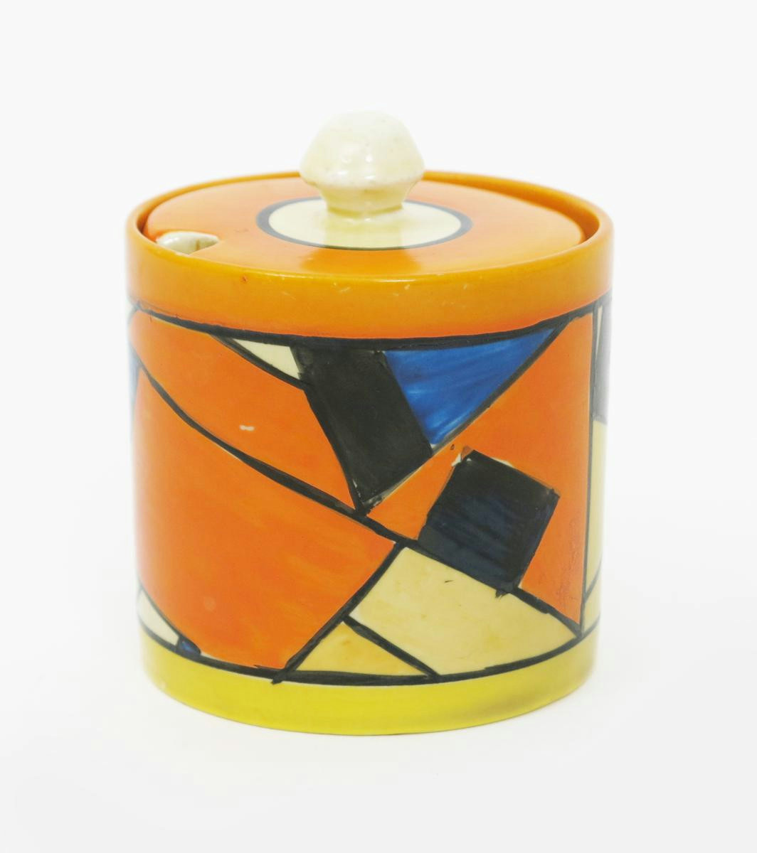 'Cubist' a Clarice Cliff Bizarre Cylindrical preserve pot and cover