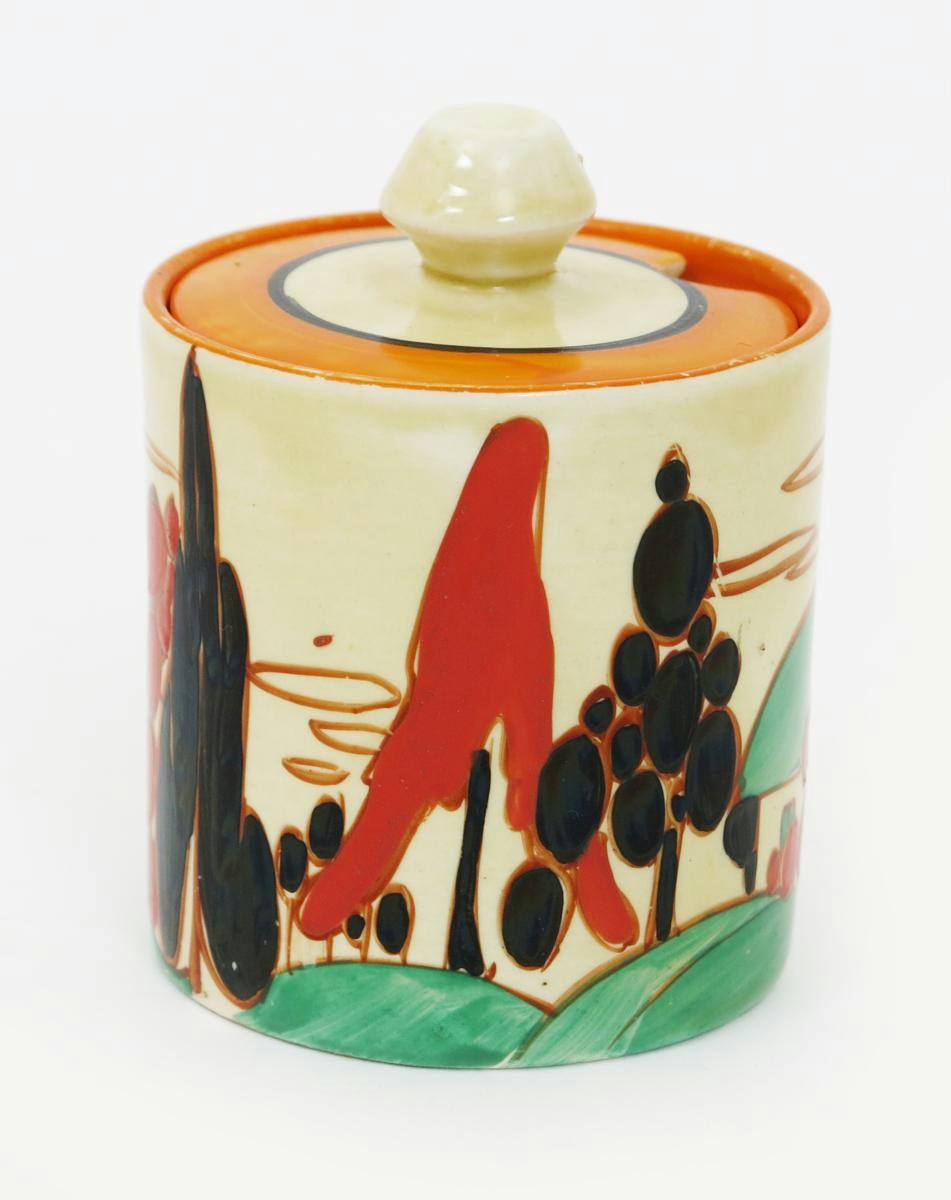 'Red Trees and House' a Clarice Cliff Fantasque Bizarre Cylindrical preserve pot and cover