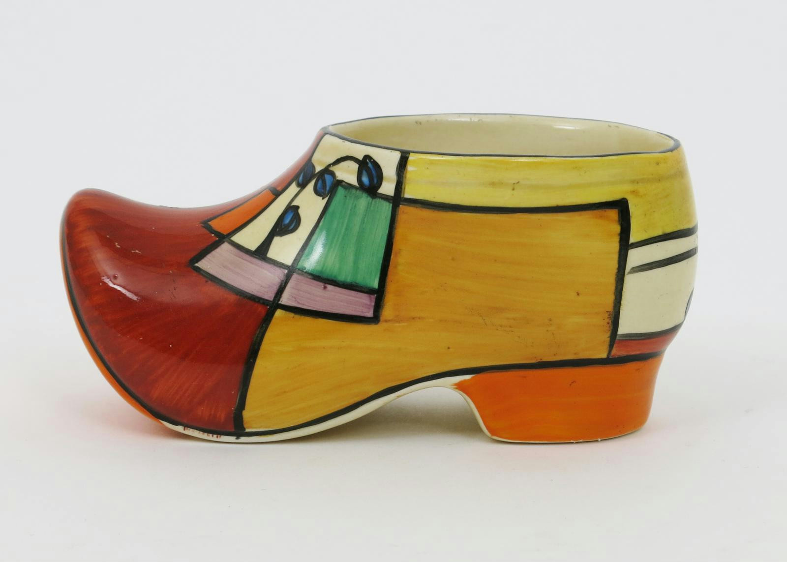 'Branch and Squares' a Clarice Cliff Bizarre Clog, painted in colours printed factory mark, 13.5cm. wide