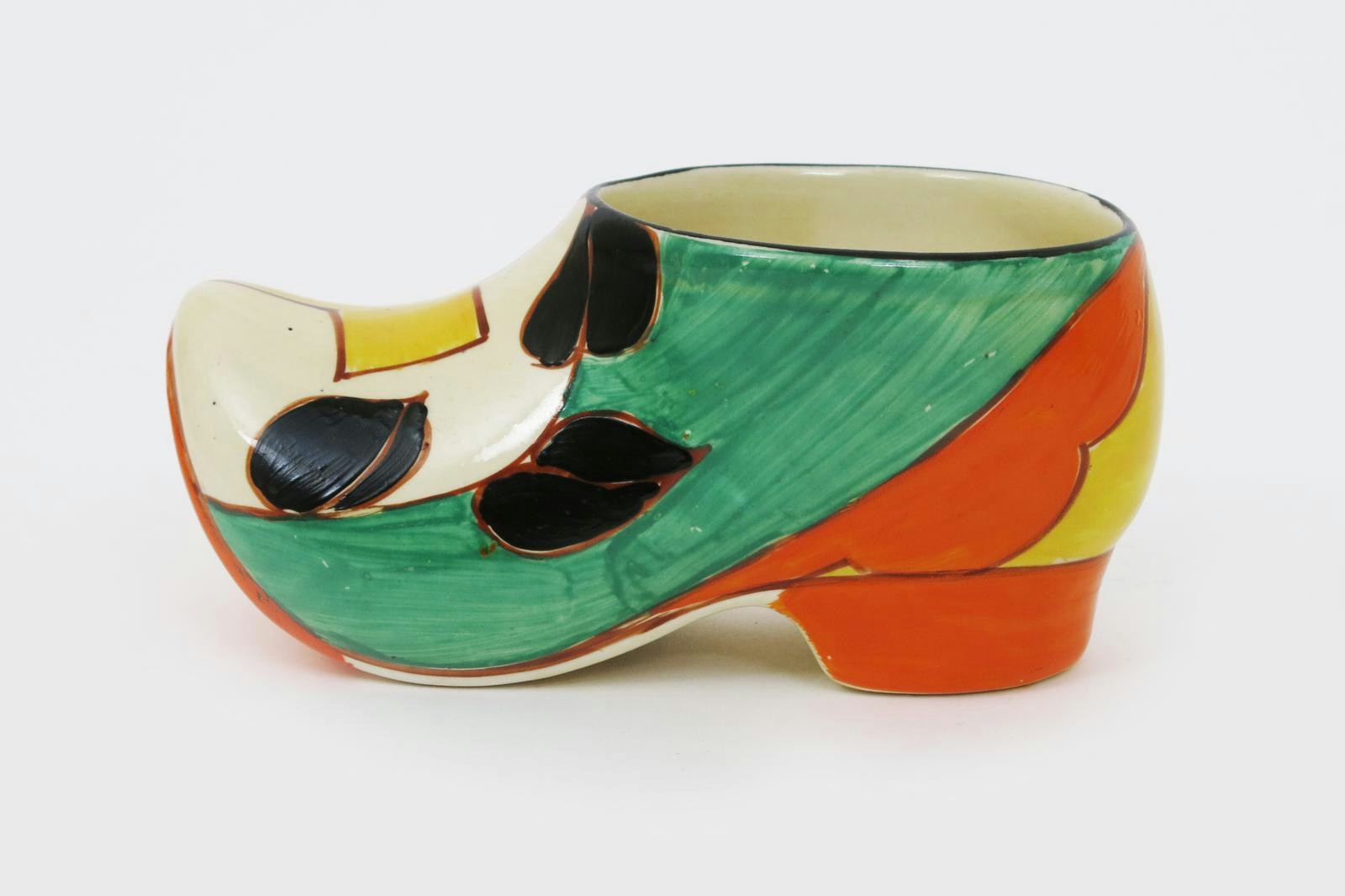 'Feather and Leaves' a Clarice Cliff Fantasque Bizarre Clog, painted in colours printed factory marks, 13cm. wide