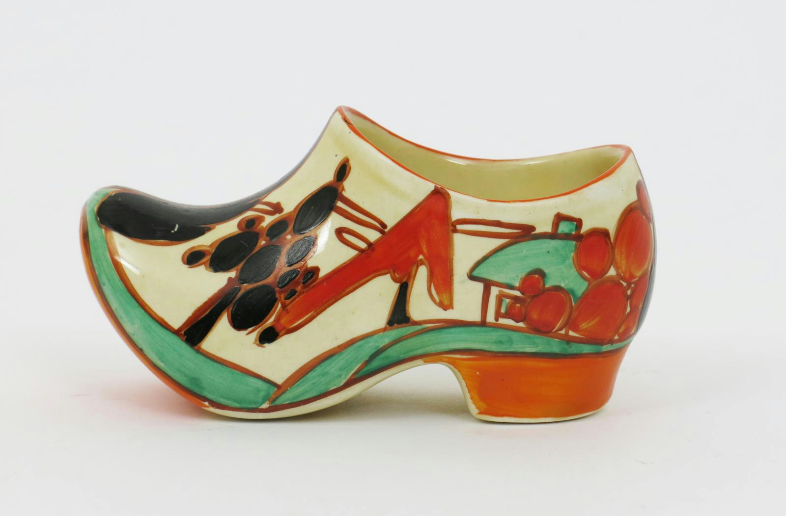 'Red Trees and House' a Clarice Cliff Fantasque Bizarre Clog, painted in colours printed factory marks, professionally restored 10.5cm. wide