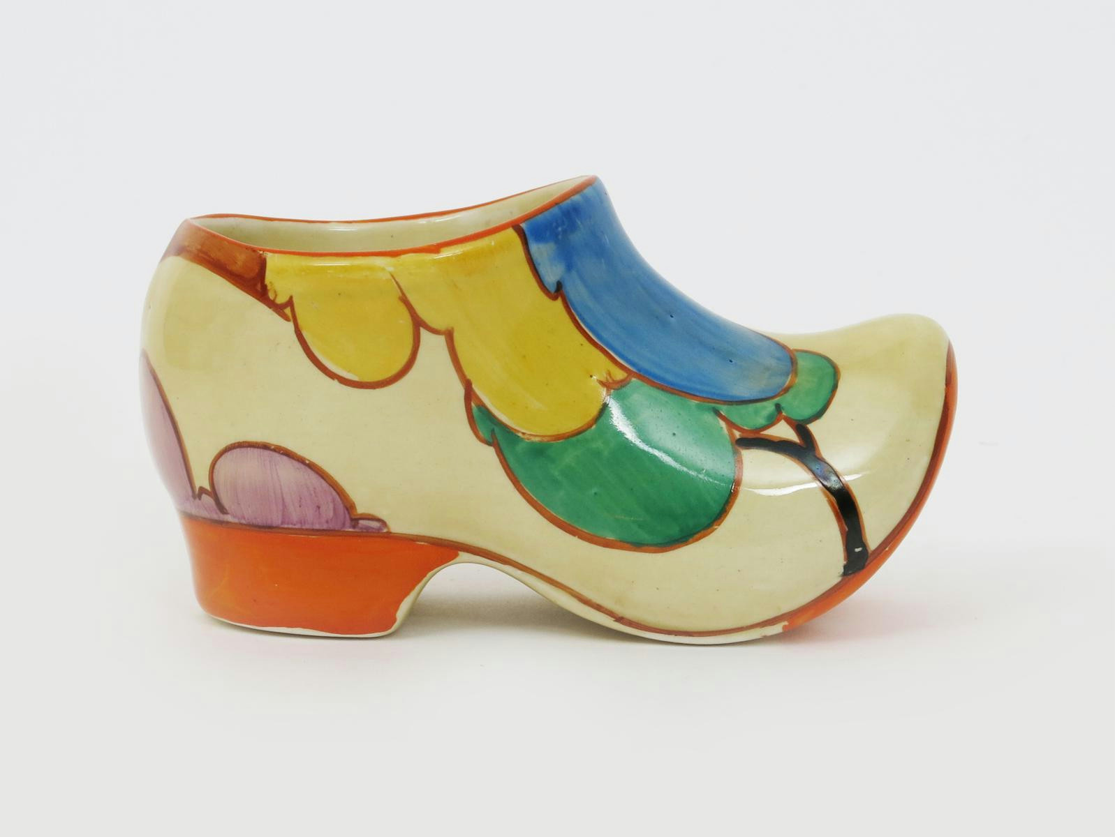 'Blue Autumn' a Clarice Cliff Fantasque Bizarre Clog, painted in colours, printed factory mark, 13cm. wide