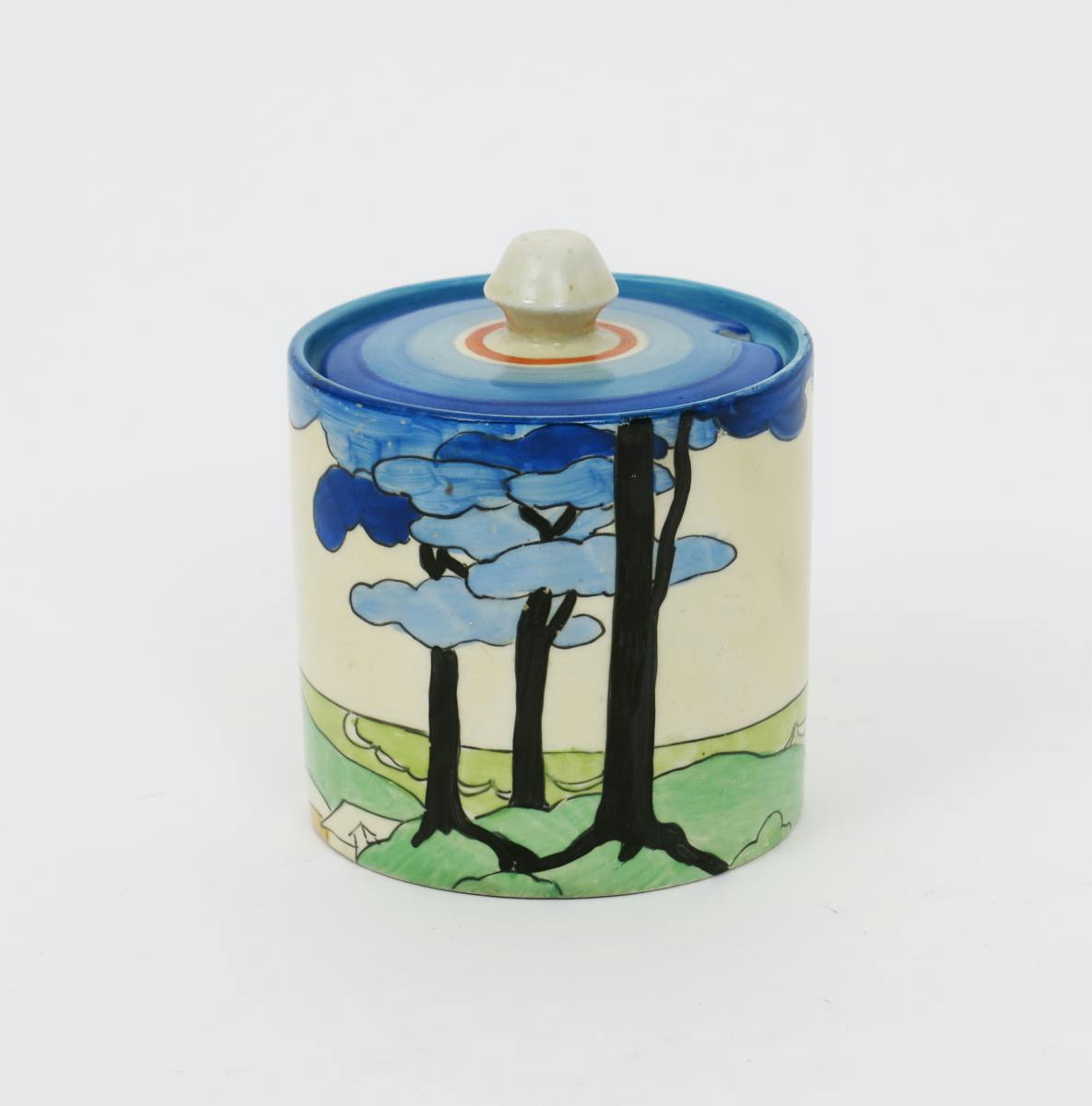 'Blue Firs' a Clarice Cliff Bizarre Cylindrical preserve pot and cover