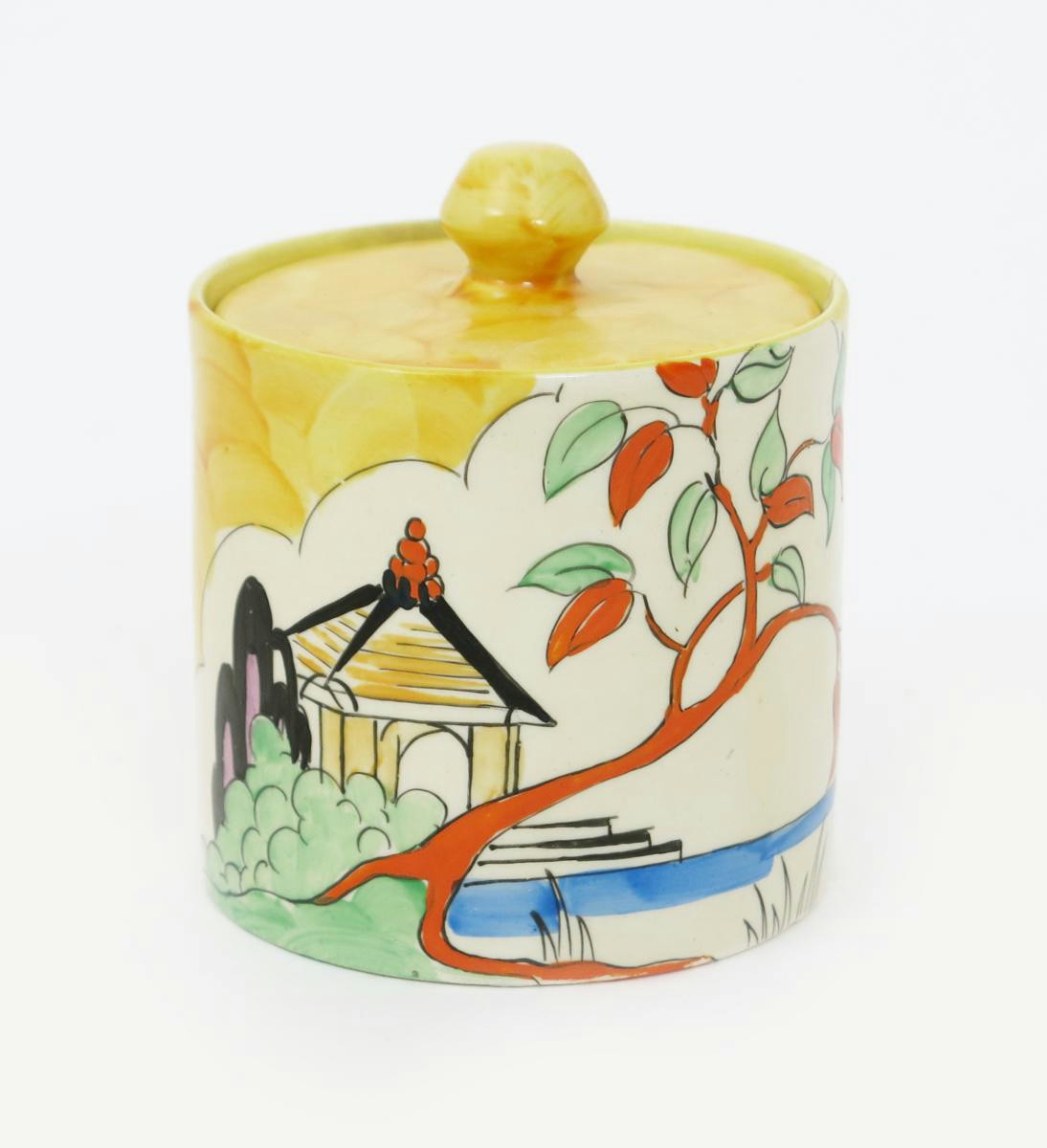 'Japan' a Clarice Cliff Bizarre Cylindrical preserve pot and cover
