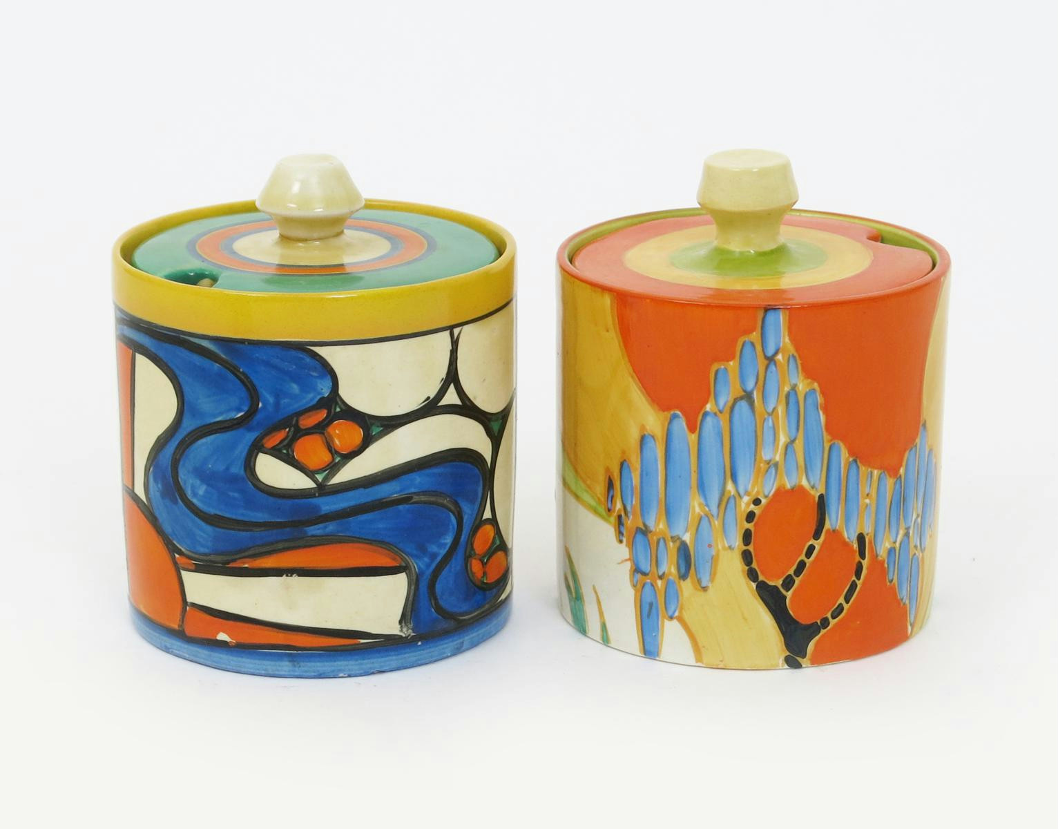 'Sunrise' a Clarice Cliff Fantasque Bizarre Cylindrical preserve pot and cover, painted in colours and a Clarice Cliff Windbells Cylindrical preserve pot and cover, printed factory marks, restored 9cm. high (2)